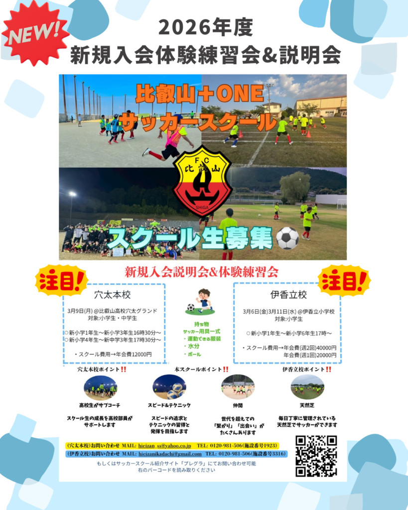 【穴太校】令和8年3月9日(月) U9(新小学1年生~3年生)16時30分~ U12(新小学4年生~6年生)U15(中学生)17時30分~ 申込みに関しては下記の方法でお問い合わせください。 問い合わせ:メールもしくは、お電話にて受付しております。 ご連絡の際に下記の①~④+ご用件を連絡下さい。 ①お名前(フリガナ)②学年(小中学校名)③お電話番号 ④所属チーム名 メールアドレス:hieizan_ss@yahoo.co.jp フリーダイヤル:0120-981-506(施設番号1923) |